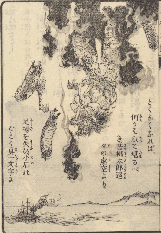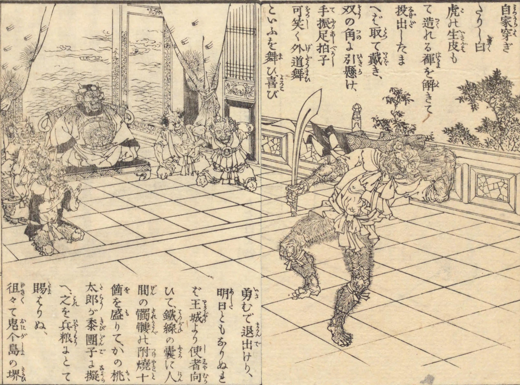 "I'll easily cross over to Japan in one stride and use three fingers to pluck off Momotaro's head. If I go to battle with courage, I will seize and return the treasures of this country."