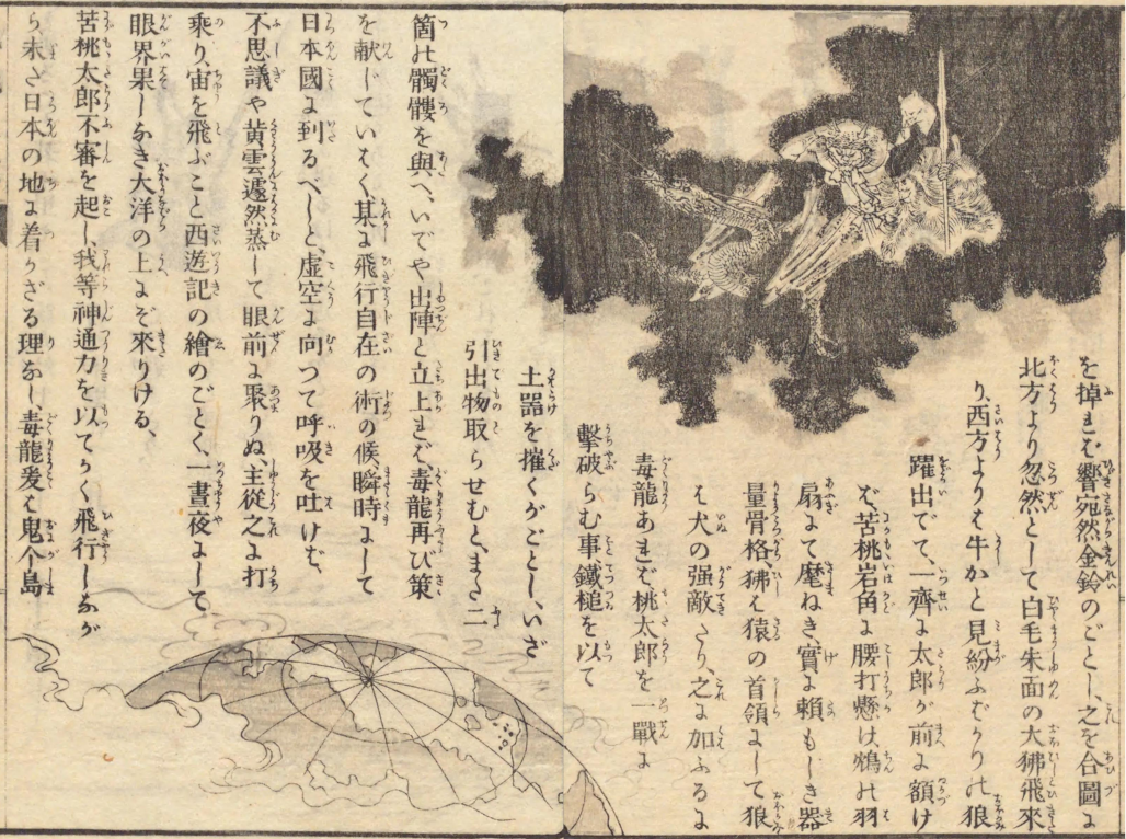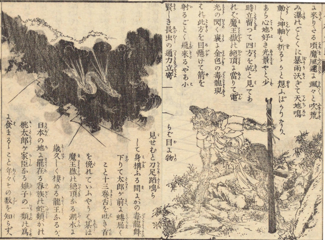 Bitter Momotaro continued on to the border of Demon Island. A hellish wind suddenly raged. Torrential rains poured down like a waterfall. Heaven and Earth trembled. He imagined the southern axis would snap. This scene pleased his heart. For a short time, he stood still and peered around sharply in all directions.
