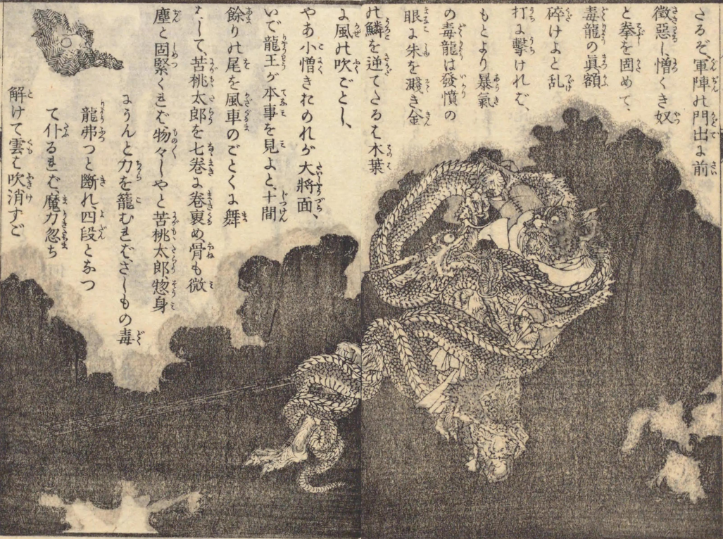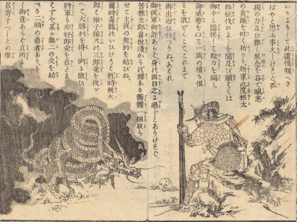 "I am the Dragon King. I've lived for many years in the lake at the summit of Demon King Mountain. Serpents are my vassals in the land of Japan. Although I don't know the number, each year, many of them are eaten by the pheasant vassal of Momotaro. I've brooded a long time over this long-lasting resentment. By myself, I don't have the strength, so I suppressed my resentment and spit out angry flames.