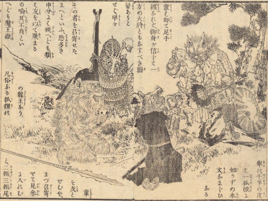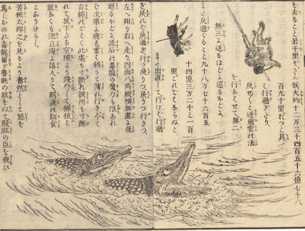 Several swings of the dragon's tail resonated like a golden bell. With this signal, suddenly from the north, a massive red-faced baboon with white fur flew in. From the west, a wolf so huge it could be mistaken for an ox sprang forth. Bitter Momotaro bowed his head to them, sat on the edge of a rock, and waved his fan of pheasant feathers.
